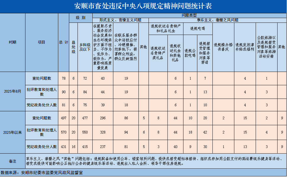 2025年8月安顺市查处违反中央八项规定精神问题统计表