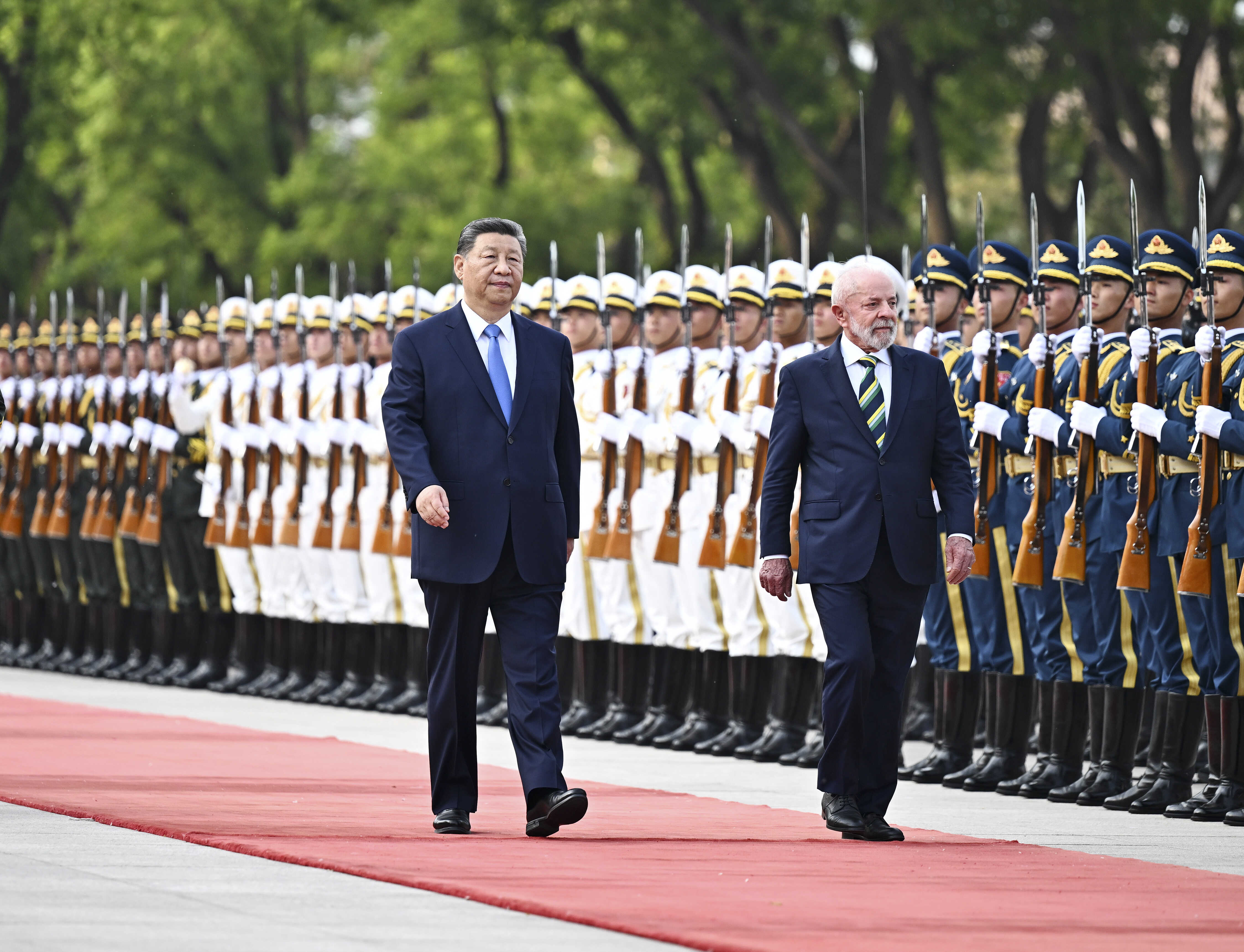 5月13日下午,国家主席习近平在北京人民大会堂同来华进行国事访问的巴西总统卢拉举行会谈。这是会谈前,习近平在人民大会堂东门外广场为卢拉举行欢迎仪式。新华社记者 燕雁 摄